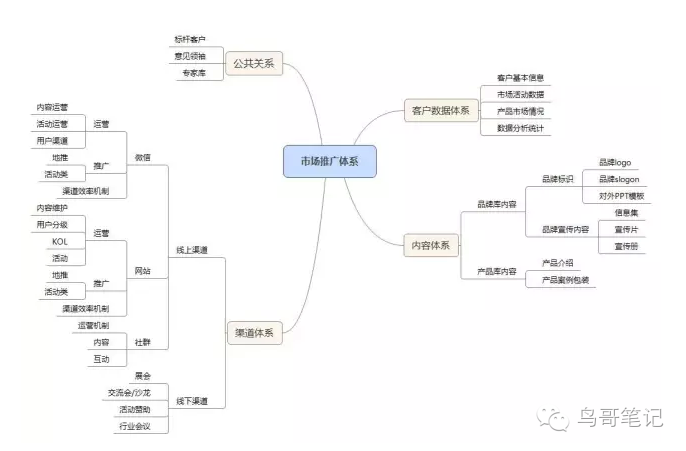 客户数据体系: 从行业、业务到你的市场活动、客户信息,需要全面了解你所接触的各项信息,这样才能时刻保持产品在市场的警惕,并及时通过数据进行市场战略的调整。 内容体系: 因为任何一个公司的市场推广都是虚实结合,所以在这里粗略的分成品牌内容(虚)和产品内容(实),目的是梳理两者的价值定位,统一对外宣传口径,提高对外价值传递效率。 渠道体系: 无论是新闻稿,深度稿还是展会、沙龙,都是对外发声的一种渠道和形式,所以只要公司对外发声,那么就离不开渠道的支持。在这里,我粗略的分成线上渠道和线下渠道,而我们日常所关注的具体渠道都可以对应到这两方面。 公共关系: 因为本人不了解PR所涉及的工作,所以这里所指的公共关系,更多是从专家、权威机构等第三方人物/机构来阐述。 二 客户数据体系 正常情况下,每个公司都会有自己CRM系统,但是CRM系统的出发点是为了协助销售人员了解和管理他们的客户信息。那么从市场的角度出发,如何用数据来规划市场战略,如何用数据来调整市场策略,并掌握客户的行为喜好等内容就显得很重要。 目的1) 支撑并指导未来市场活动,最终用数据说话 2) 了解客户喜好,最大化提升活动效果 内容1) 客户基本信息 2) 产品市场信息 3) 市场活动信息 4) 数据分析统计 说明1) 客户基本信息 主要包含4部分:客户的基础信息(姓名、单位、手机等)、客户的销售信息(贡献产品,购买产品等)、客户的使用信息(产品使用情况、关注点等)、客户的反馈信息(满意度等)。目的是全方位了解客户情况,掌握客户喜好,并应用到今后的市场活动中。 2) 产品市场信息 指的是行业信息,主要是从业务角度出发,了解行业的大背景,包括市场占有率、应用率等内容,为市场战略规划做数据依据 3) 市场活动信息 涉及以往活动的数据以及活动类型,一方面可以评估活动的效果,一方面可以为今后的活动做数据参考 4) 数据分析统计 主要为市场活动做数据分析,需要结合产品市场信息和市场活动信息两方面做分析,这也是数据体系里最为重要的一环。比如,通过产品市场信息,我们可以了解到哪些地区的市场占有率高、应用率却很低;哪些地区的市场占有率低,但应用率却很高,通过四象限分析法,可以大致的分成4类: