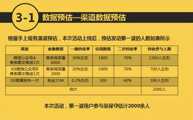 设想那些获奖用户下载你的APP之后兴奋的进来领奖,但却找不到任何领奖的入口提交中奖信息,估计连摔手机的心都有了。 这种通畅甚至可以根据奖品种类的不同不断延伸。 像电子书这样的奖品可以自动打到账户上,如果是实物奖品,则需要用户提交自己的个人信息如电话,姓名,地址。 用户提交完电话后,应有客服人员通知他已提交成功,并告诉他已安排奖品的寄送。 甚至也可以用APP的私信功能告诉用户获奖的奖品已经寄送到哪一步了,让用户随时做到心中有数。 活动运营的关键就在于每一个细节点都能无限的串联和延展,让用户永不会在活动中充满迷茫感。 越到活动最后,越不能掉以轻心。 三 至此,一整套活动的流程设计就已经全部结束。如果再完善一点,可以多加一页,用来撰写更详尽的活动规则说明及活动机制的详细细节。 既让开发人员明白,更能让众多细节在你的心中不断地捋清楚。 那接下来,根据渠道效果预估活动的参与人数是一件很重要的事情。 尤其是预估活动的第一波参与人数。 如果很多活动在刚开始就不能快速聚拢大量的参与者并进行扩散,那整个活动会至始至终处在一个很“闷”的境地。 所以通过盘点手上可用的渠道并进行一个简单的初始发动用户数据预估,可以让你清晰的了解做这个活动到底值不值得做,是不是在浪费时间。 我们假定在本次活动中,手上掌握三个比较主要的推广渠道: 一个微博,两个微信公众号。 那我们如何进行一个比较合理的数据预估,来计算出本次活动的第一波用户数呢?